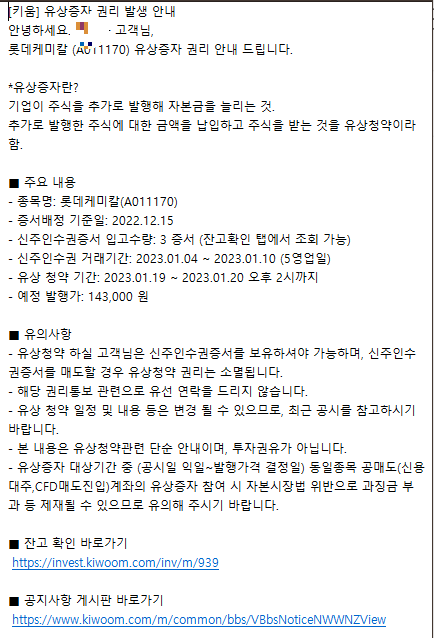 예) 예정발행가가 143,000원인 롯데케미칼 6R을