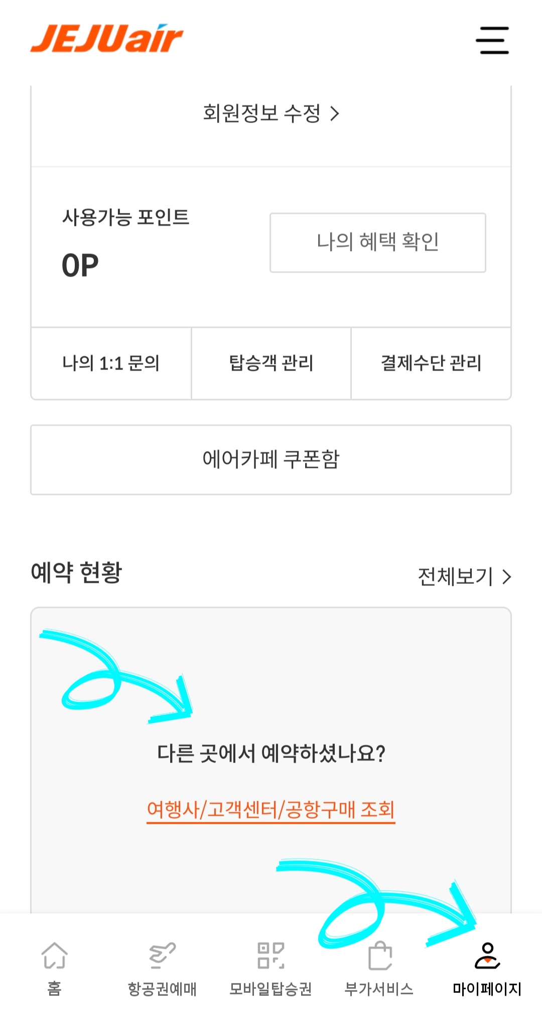 스카이 스캐너에서 최저가 검색으로 하나투어(여행사)에서 제주항공 필리핀 행을 예약했습니다. 그런데 제주항공 앱에서 예약 내역이 조회가 안돼서 헤매다가 알아냈어요. 하나투어 또는 여행