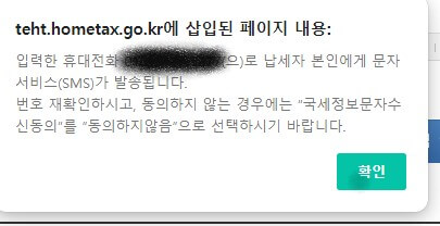 - 휴대전화번호 입력,국세청정보문자수신 동의 했습니다.