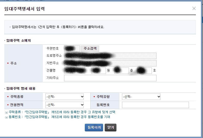 "등록하기" 클릭하면 임대주택 명세서에 등록 되어있습니다.