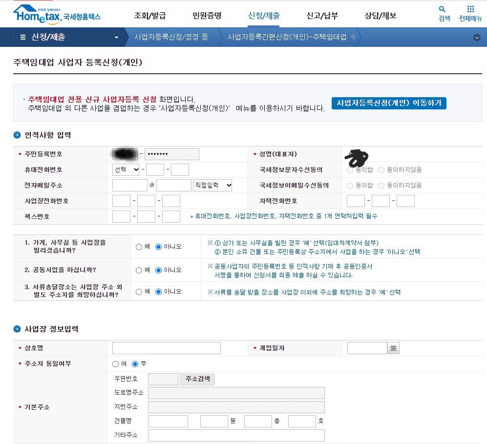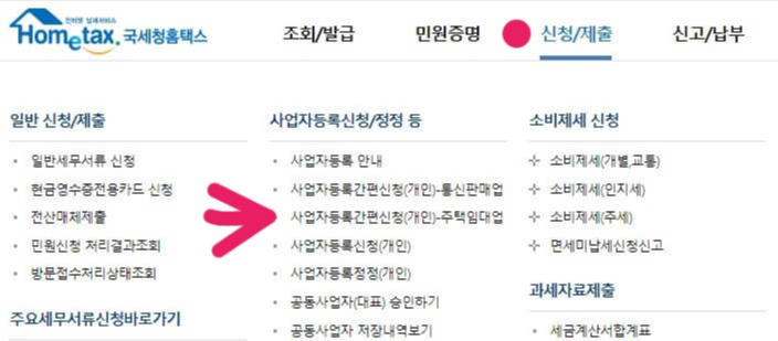 5. 다시 신청/제출 → 사업자등록간편신청 -주택임대업 클릭