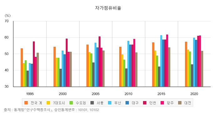 *자가점유율:71.7%(‘70년) → 58.6%(’80년) → 49.9(‘90년) → 53.3%(’95년) → 54.2%('00년)→ 55.6%('05년)→54.2('10년)→56.8('15년)
