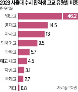 올해 서울대 수시모집 합격자 중 일반고 출신은 줄고 특수목적고(특목고)·자율형사립고(자사고) 출신은 늘어난 것으로 나타났다. 교육부가 앞으로 고등학교 내신을 절대평가 방식으로 전환하면 상위권 대학의 특목고·자사고 출신이 더 늘어날 것으로 예상된다.